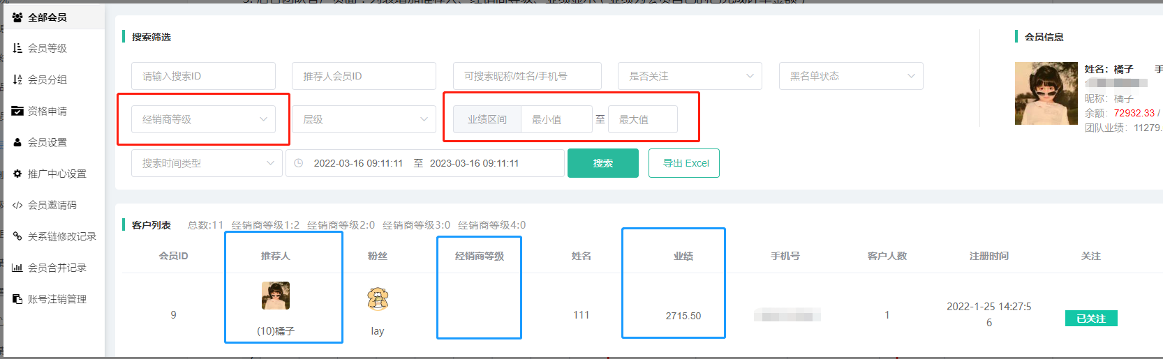 4. 后台团队客户页面:导出增加推荐人、业绩、团队中经销商等级人数显示