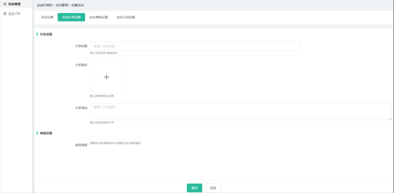 (3)开启新海报插件后,分享设置可选择海报模板,需在新海报插件中添加定金阶梯     团海报,选择模板后会以模板生成推广海报,否则默认模板生成;