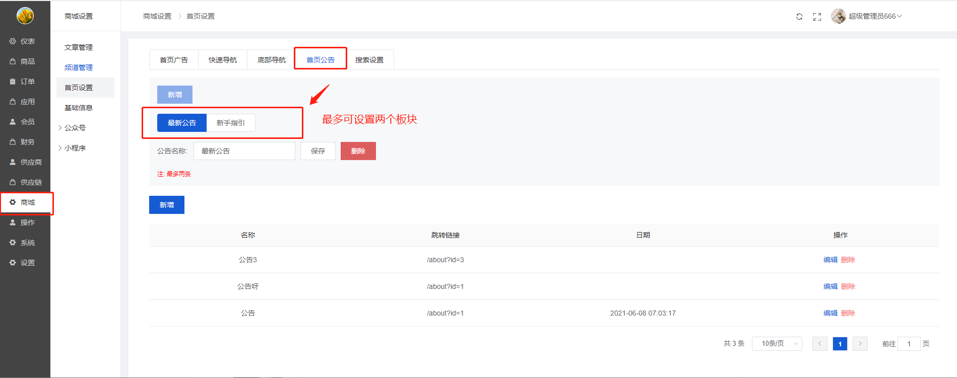 2)首页公告最多可以设置两个模块