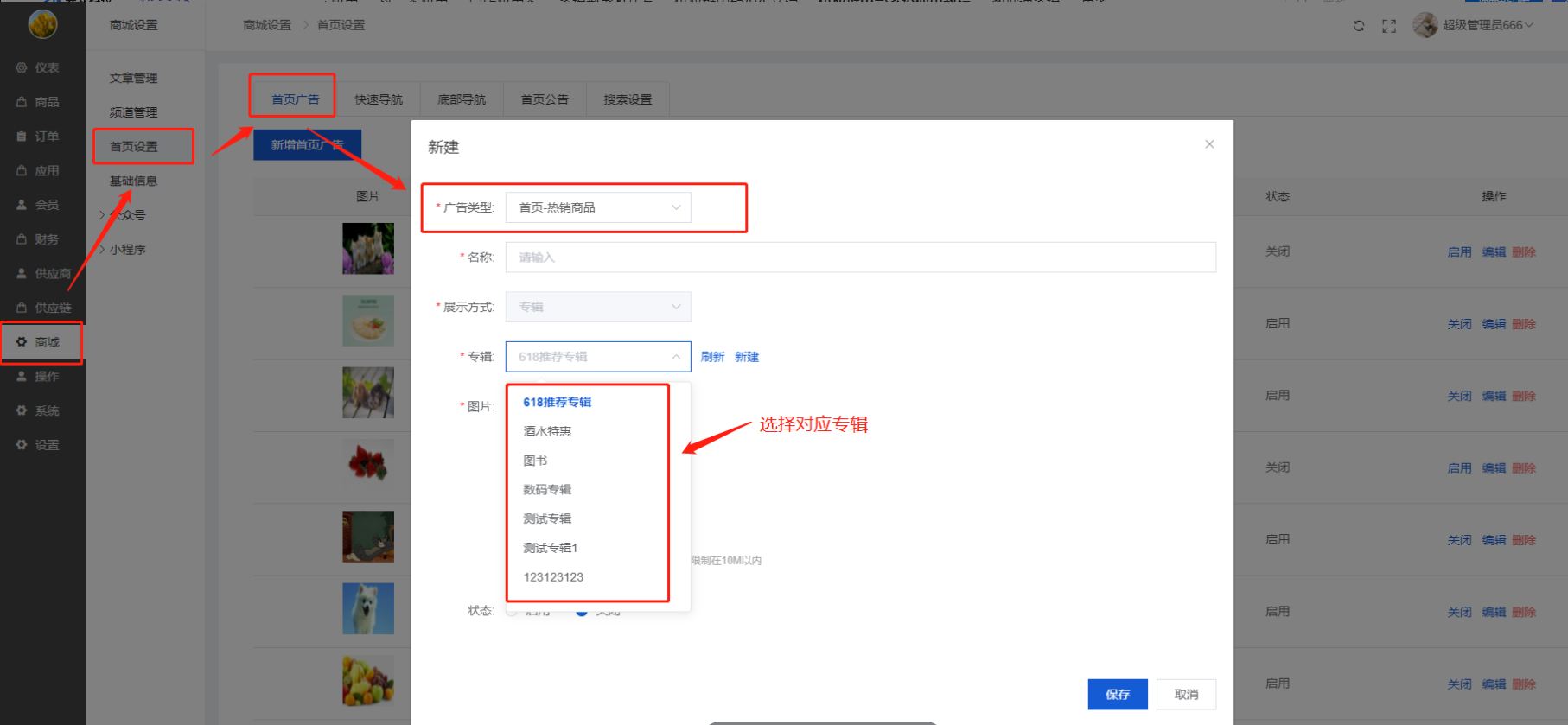 【广告类型】可以选择:首页轮播、首页-主频道、首页-副频道、首页-热销商品、首页-产品专辑、首页-推荐商品;