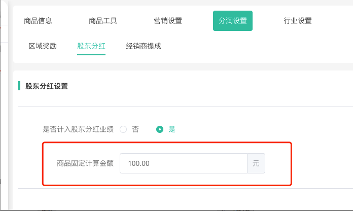 (3)商品固定金额:(累计上一个周期商品独立设置的金额)(设置路径:商品编辑--分润设置--商品固定计算金额)