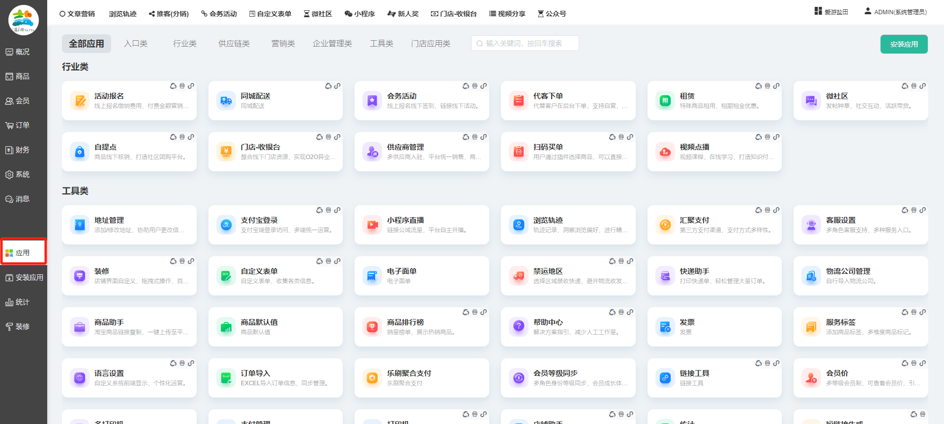 目录 搜索 展开 一、前期准备资料二、数字乡村码-上线操作指南1、服务号的申请流程及认证2、申请小程序流程3、开放平台绑定小程序和公众号三、数字乡村码-系统操作数字乡村码系统管理-概况数字乡村码-商品管理1、发布商品2、商品列表3、商品表单4、商品分类5、品牌管理6、配送模板7、评论管理8、优惠券管理9、商品标签10、退货地址设置11、满额优惠12、批量操作13、配送方式14、基础设置15、商品隐藏四、数字乡村码-会员管理1、全部会员2、会员等级3、会员分组4、资格申请5、会员设置6、推广中心设置7、会员邀请码8、会员关系链修改关系链修改记录9、会员合并记录10、账号注销管理11、会员设置中心五、数字乡村码-订单管理1、订单管理列表2、订单处理流程3、订单状态4、订单修改价格5、订单退款退货6、多包裹发货7、批量发货订单操作步骤8、催发货订单9、物流查询六、数字乡村码-财务管理1、余额设置2、会员余额3、充值记录4、转让记录5、余额明细6、收入明细7、提现设置8、提现统计9、积分管理10、转账审核11、收益广告12、批量充值七、数字乡村码-系统管理1、商城入口2、商城设置①、商城设置②、订单设置③、物流查询④、短信⑤、联系方式⑥、分类⑦、优惠券⑧、分享⑨、幻灯片⑩、广告位⑫、地图设置3、交易设置4、微信模板消息自定义消息模板(新版)自定义消息模板(旧版)小程序消息模板公众号模板消息变更公告5、语言设置6、权限管理7、多媒体管理八、数字乡村码-消息管理九、数字乡村码-应用管理十、数字乡村码系统-数据统计十一、数字乡村码-页面装修DIY1、模板管理2、店铺页面3、顶部导航4、底部导航5、DIY模板市场6、首屏广告7、基础设置8、装修DIY尺寸建议十二、供应商功能插件操作指南1、供应商2、门店-收银台门店申请和使用步骤门店管理①、门店-收银台 营销设置②、门店-收银台 分润设置门店分类门店申请门店审核门店商品门店商品订单收银台订单数据统计核销员基础设置默认设置门店装修3、微社区4、会务活动十三、营销插件操作指南活动报名提货卡新人奖微店问卷调查积分视频分享1、视频分享基础设置2、视频分享发现管理3、视频分享分类管理4、视频分享评论管理5、视频分享分红记录6、视频分享短视频中心每日红包幸运大抽奖签到优惠券二维码任务奖励优惠劵文章音频文章付费文章限时购新海报拓客卡操作流程积分活动素材中心视频红包十四、入驻门店应用类1、门店预约2、附近商品3、门店定位设置4、门店控制5、门店满额包邮6、门店满额减7、导入商品8、门店搜索9、门店股东10、核销券11、多门店核销1、商城后台设置2、前端功能演示十五、常见问题1、后台登录密码修改流程2、会员-余额,积分,后台如何进行充值与扣除3、如何修改上下级关系4、一种万能的获取商城小程序路径的方法 暂无相关搜索结果! 阅读次数:2107 本文档使用 模王系统 发布 九、数字乡村码-应用管理 九、商城管理-应用显示所有商城已安装并启用的应用,包含以下大类:具体根据自家商城后台系统显示为准。每个应用功能设置步骤较多,请查看相对应应用的学习文档。文档更新时间: 2024-01-08 10:36 作者:链上旅行