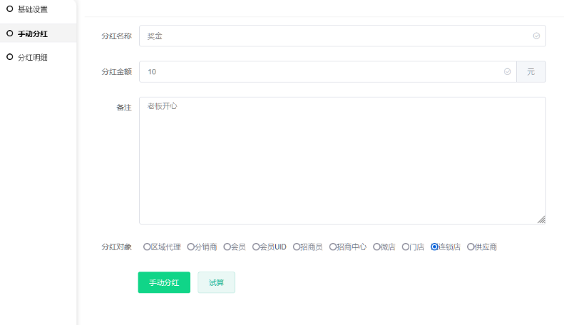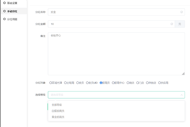 功能概述:给特定会员手动分红。注:给特定会员发放分红时需谨慎,请勿重复操作,发放分红若有延迟,刷新页面等大概2-5分钟观察即可。