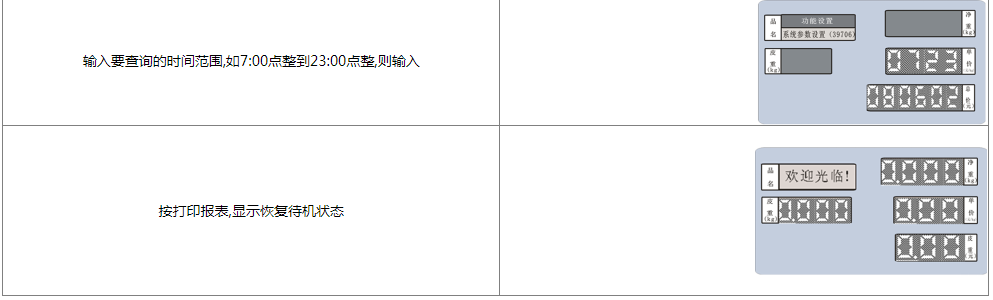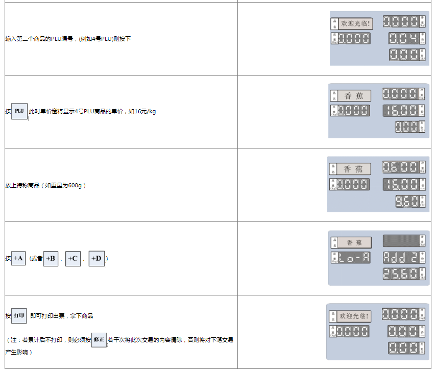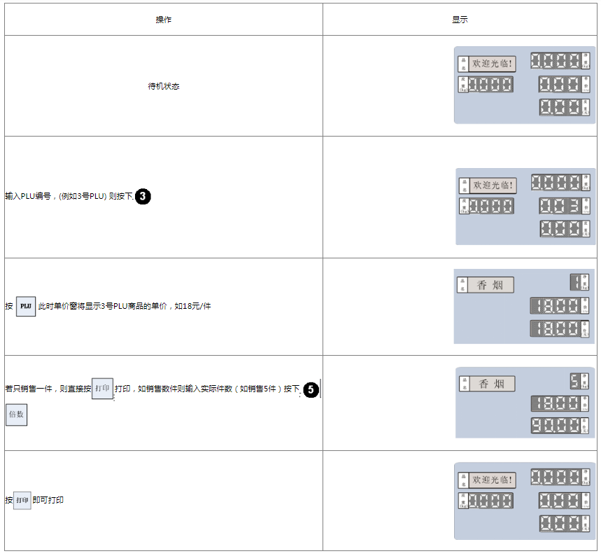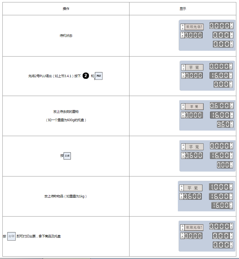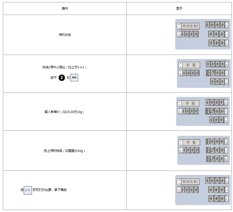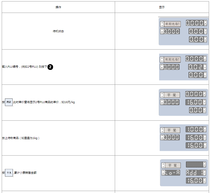 阅读本手册时,操作见表格最左列,表格其余列为实施最左列操作后条码打印计价秤各个窗口的显示内容;