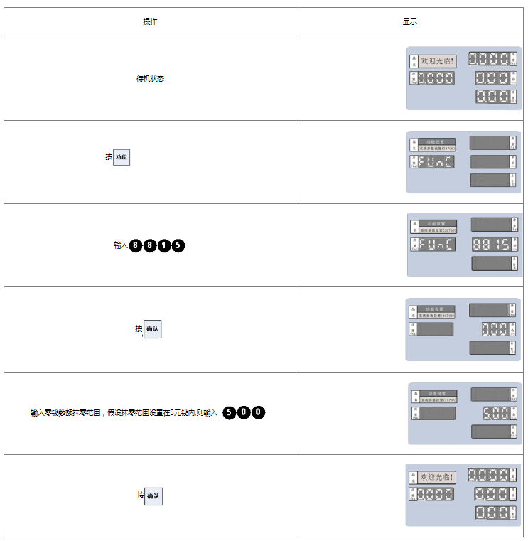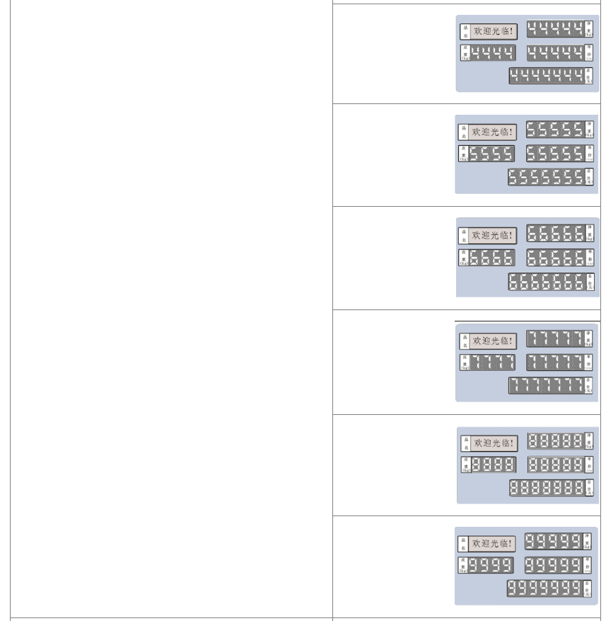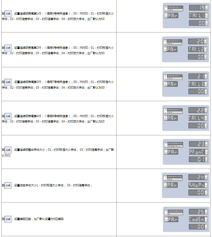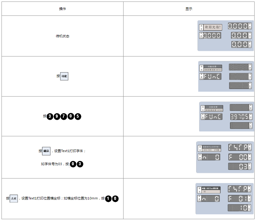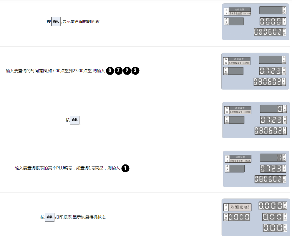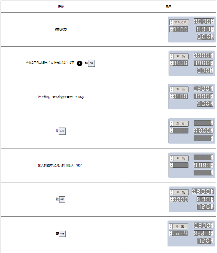 阅读本手册时,操作见表格最左列,表格其余列为实施最左列操作后条码打印计价秤各个窗口的显示内容;