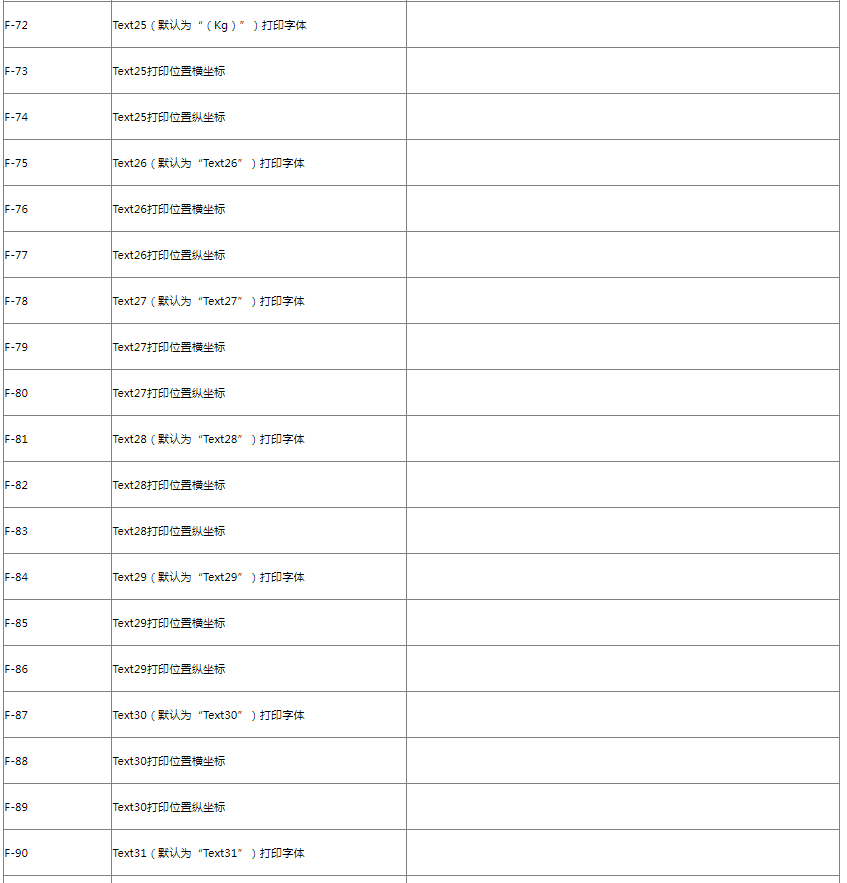 本秤可设置16条汉字文本(编号从1到16)及16条字符文本(编号从17到32),可供每种标签格式任意调用打印;其中1号汉字文本在连续纸状态下为店名。每条汉字文本内容最多可设置30个汉字,每条字符文本内容最多可设置30个字符。(注:汉字文本使用区位码输入;字符文本使用ASCII码输入。)可以用密码4001~4032进入对应的Text文本也可以输入4001~4032中的任意一个密码进入然后按倍数键切换不同的Text文本。