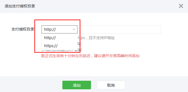 2、支付授权目录的前缀(http/https)——请点击“▼”下拉选择“https://”,不要选http://