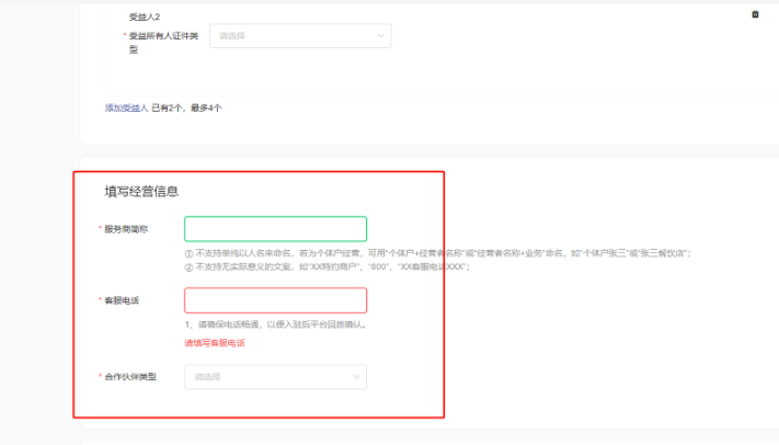 (二)服务商添加特约子商户(即门店独立后台子商户),按照提示要求填写资料,申请子商户,支持个体户申请。