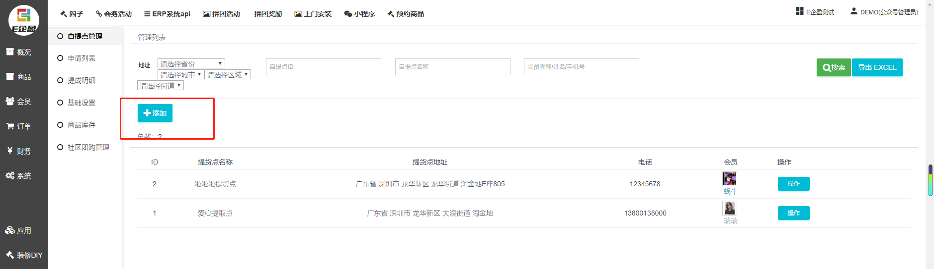 支持按照自提点地址,ID,名称,会员昵称/姓名/手机来搜索自提点