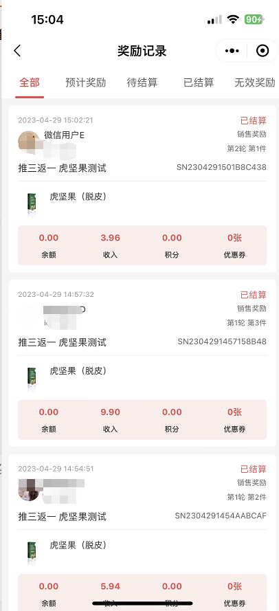 1, 显示会员获得的销售奖励记录,订单支付后产生奖励