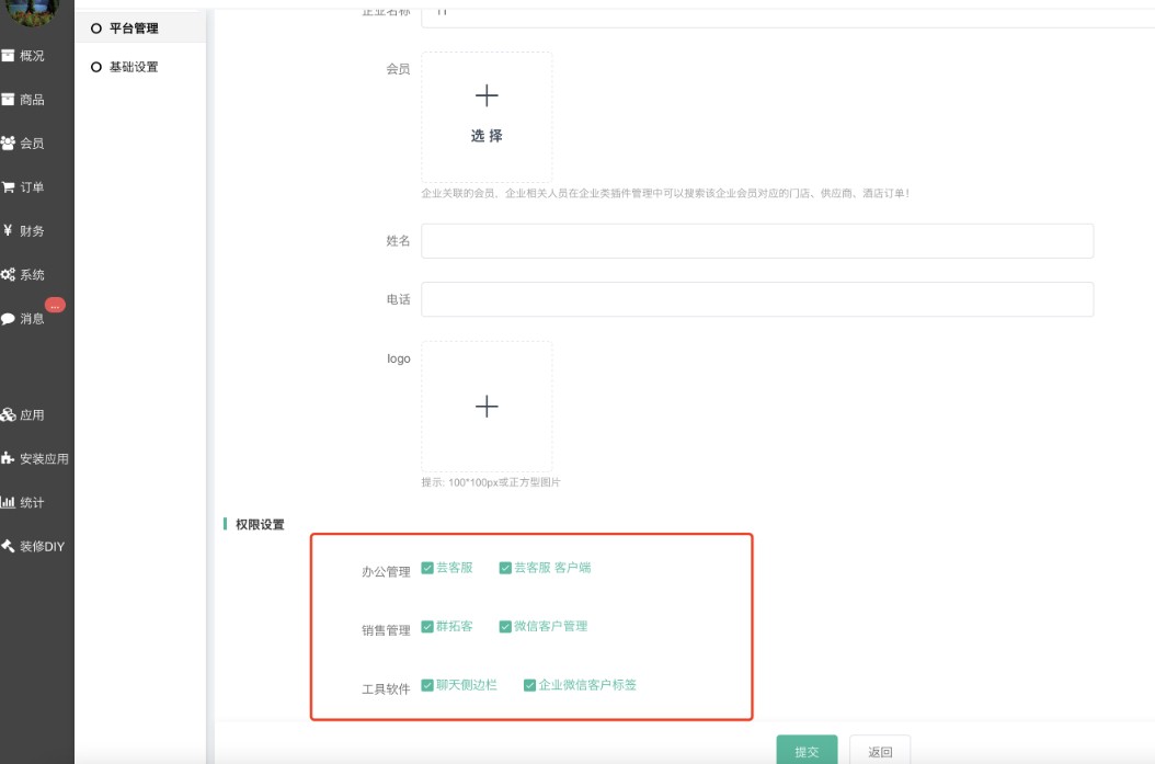 - 默认应用权限:创建企业后,该企业默认获得的应用权限,注意:不要全选,如果和商城关联数据的应用不要默认给所有企业使用,比如聊天侧边栏;