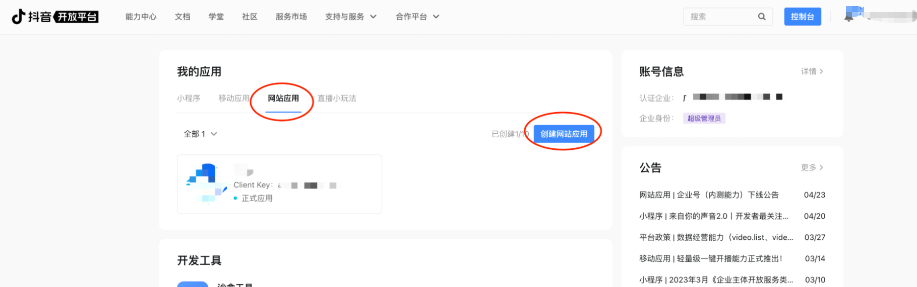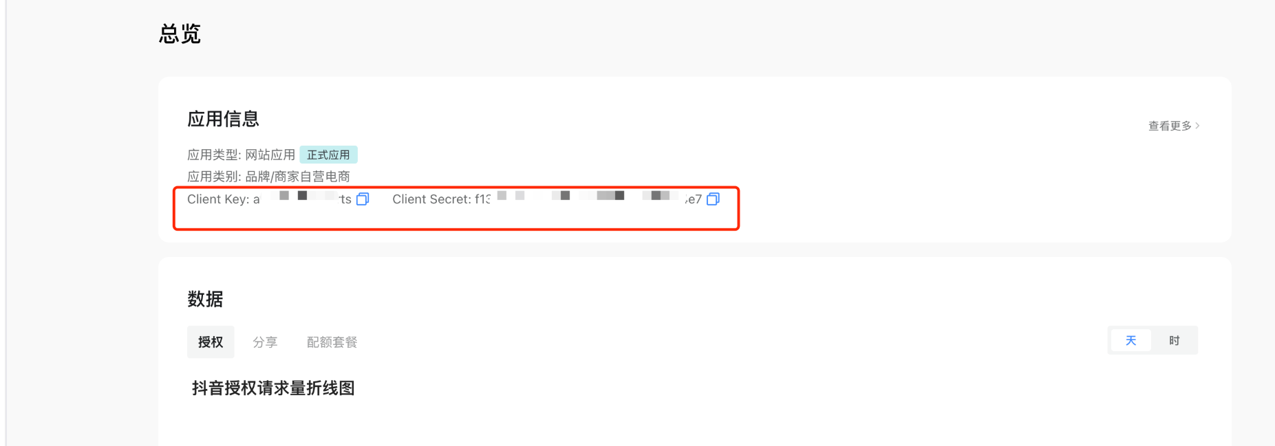 创建后即可获得ClientKey、ClientSecret信息,填入抖音设置--基础设置中即可。