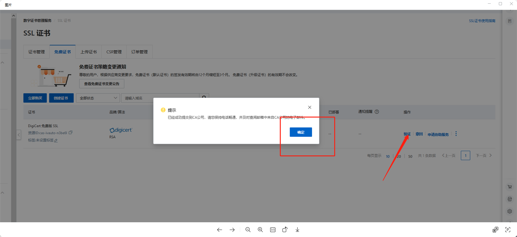 提交审核之后点击确定---点击验证