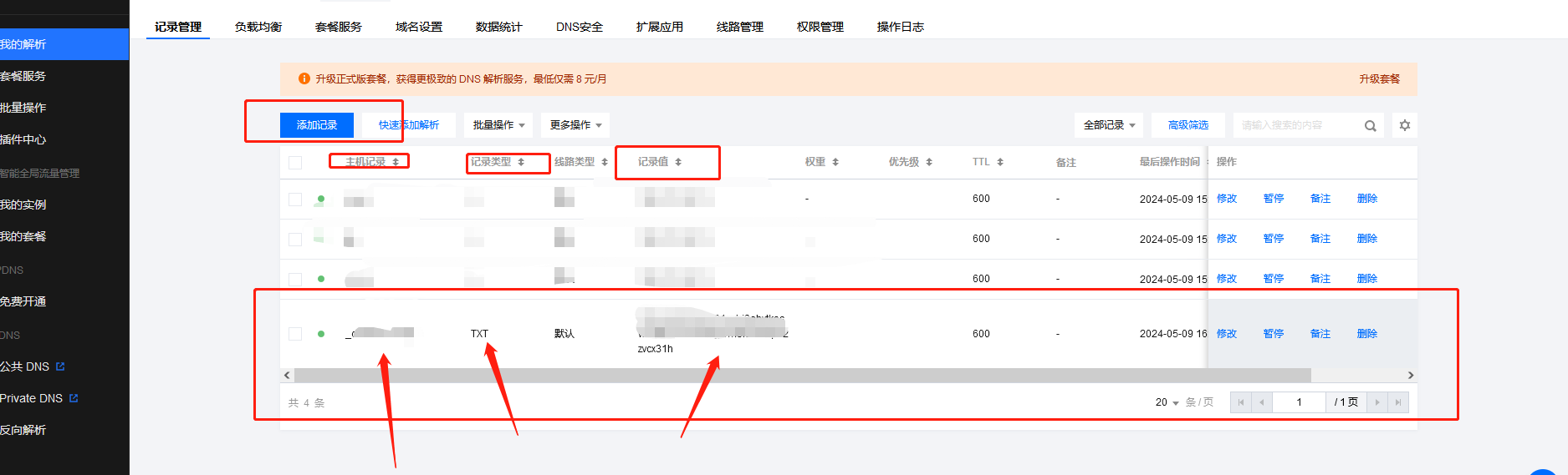 验证之后如果出现失败的提示,是因为在腾讯云后台没有添加对应的解析记录,解析记录需要按照第二点去腾讯云对应的域名里面去解析一下记录值