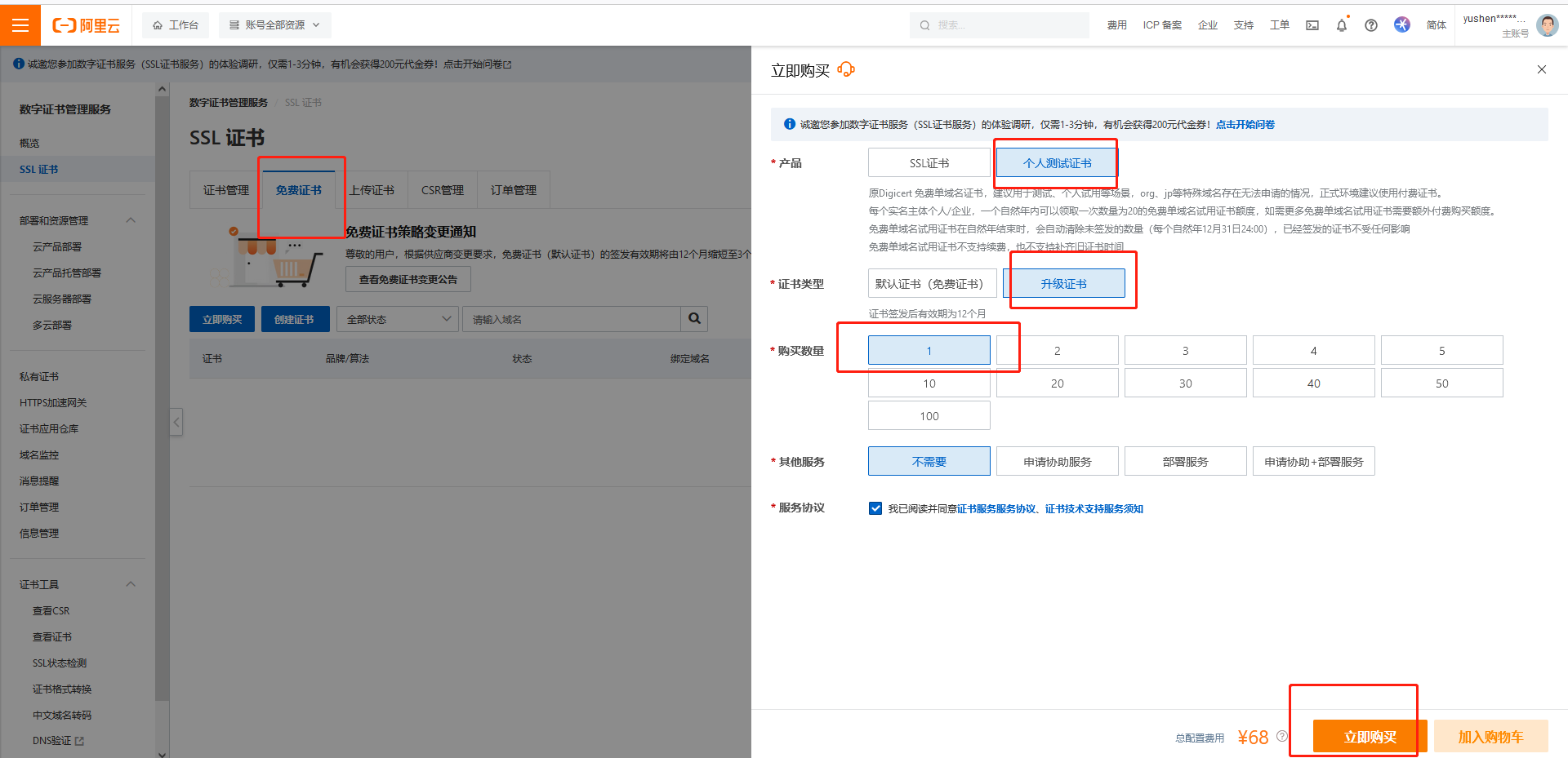 登录阿里云账号,搜索ssl证书,按照下图进行购买证书