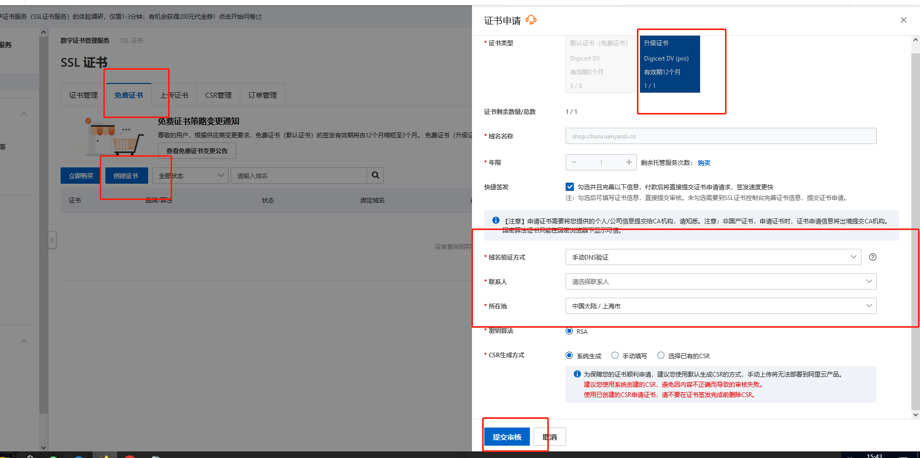 2、域名验证方式手动dns验证