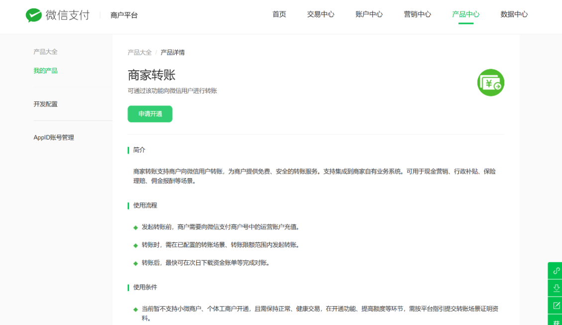 请前往微信支付商户平台> 产品中心 > 运营工具 > 商家转账 > 申请开通,按页面指引完成开通